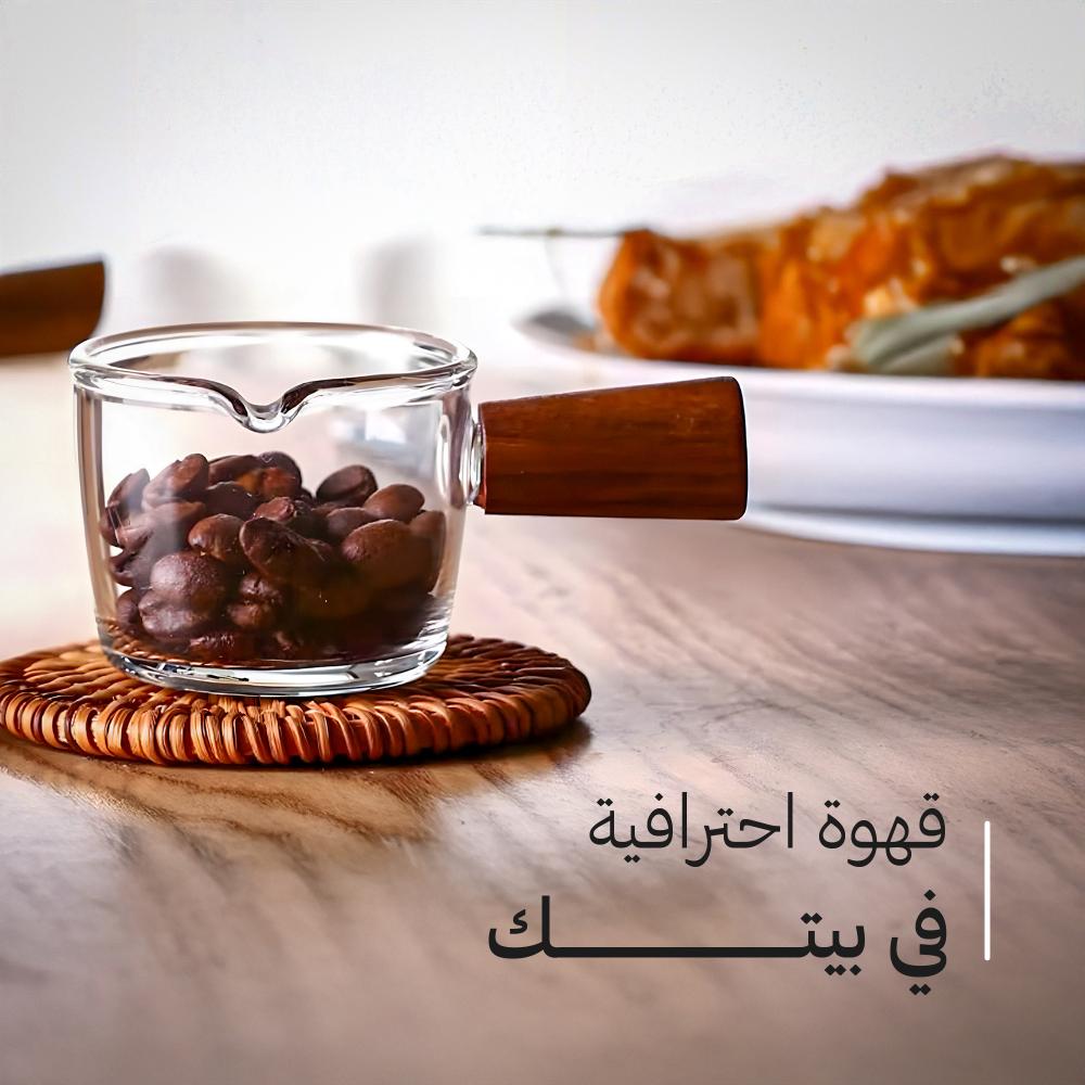 يضيف المقبض الخشبي طابعًا طبيعيًا مميزًا وراحة أثناء الاستخدام. رغم حجمه الصغير جدًا، فإن هذا الكوب الزجاجي يضفي حضورًا فريدًا على طاولتك أو ركن القهوة الخاص بك.